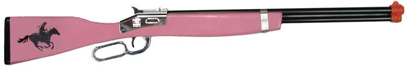 Silver plated western style lever action saddle rifle. Solid one-piece wood stock, die-cast operating mechanism, painted steel barrel with plastic parts.