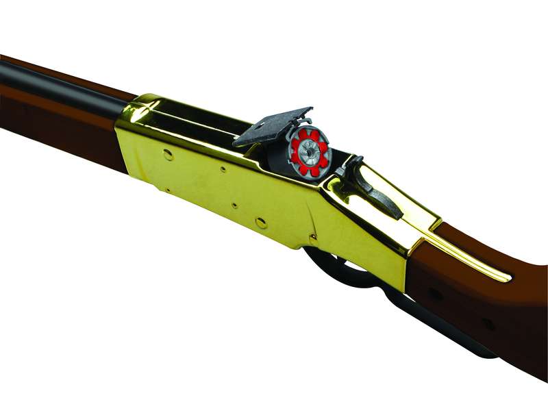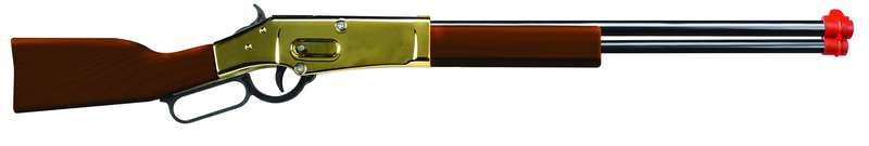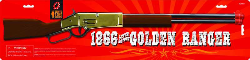 The First Gun Made of Wood & Golden Metal (Steel) to Fire #913 8 Shot Plastic Ring Caps Comes Bulk and Carded 28” Long.